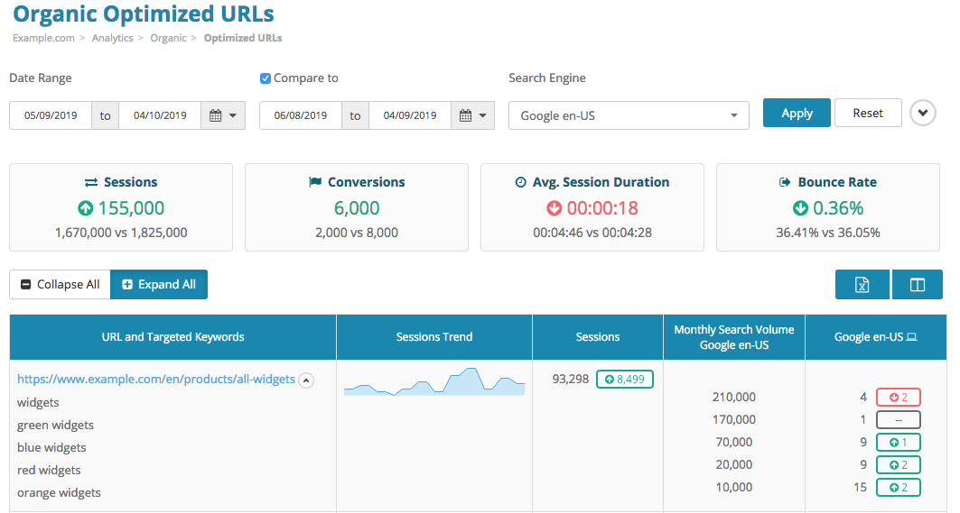 By default, all keywords that rank with these URLs will be included. If you’d prefer to only include the keywords that are set with this URL as the preferred landing page, set “Targeted Keywords Only” to True.