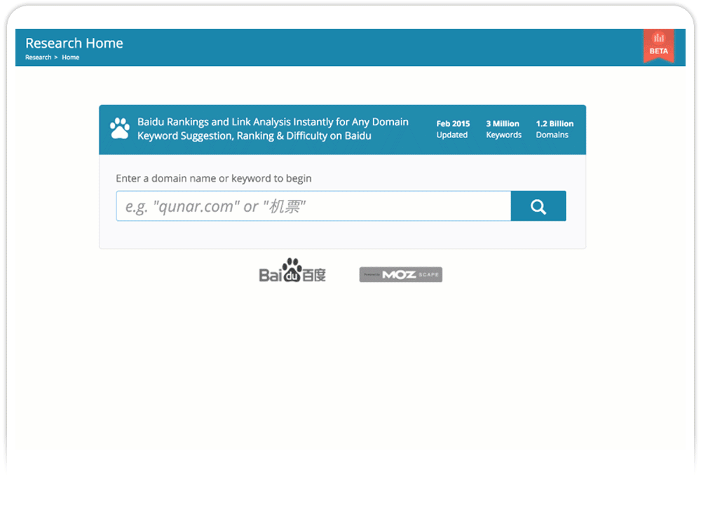 Baidu Research is being launched in beta for now. While we’ve got just about all of the bugs out, we’re going to be adding a ton more features in the following months. Be prepared for an even bigger keyword database, the ability to view a domain or keyword’s performance over time, and even more deep analysis tools for every domain in our database.