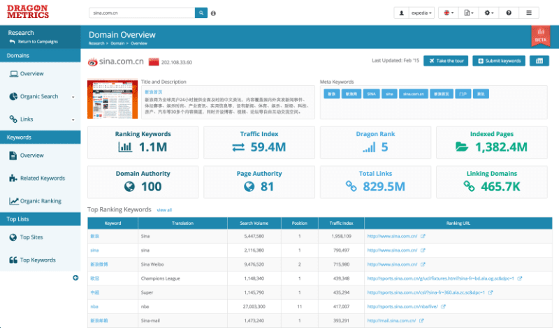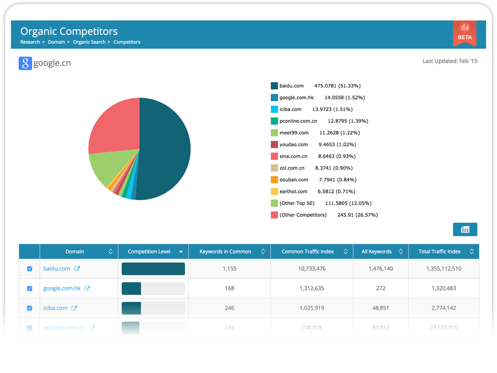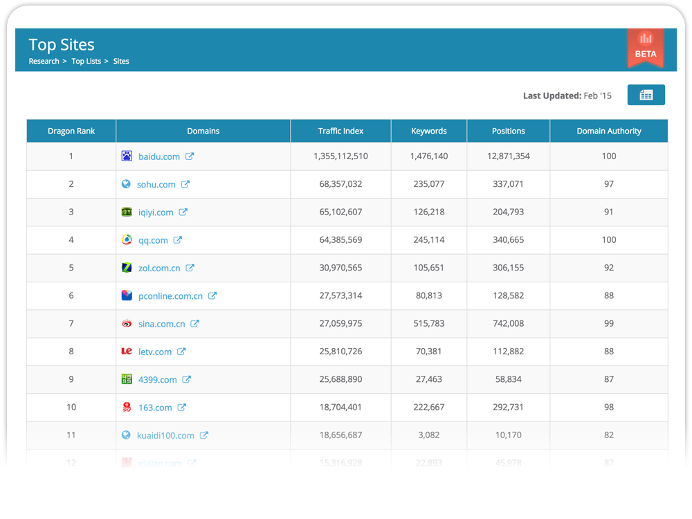 We keep track of which sites are getting the highest rankings and most organic traffic on Baidu. We also keep track of which keywords have the highest search volume. Browse each list, and click on any result to get a deeper analysis.