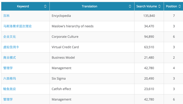 For the first time ever, Baidu SEO is now in the hands of non-Chinese international marketers. All keywords have been translated into English, and available right next to the Chinese keywords inside the tool. Now, anyone without any knowledge of Chinese or Baidu can type in their domain and instantly understand who their main competitors are, which types of keywords they’re ranking for, and which ones are lagging behind.
