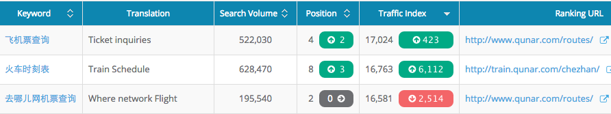 So now once you log into the Baidu Research area and look up any site, you’ll see the historic data for the number of ranking keywords, estimated traffic, and change indicators for each ranking keyword to see how each keyword has been doing over time.