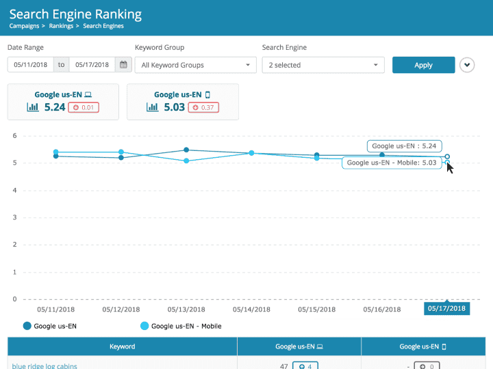 View desktop and mobile data side-by-side to compare ranking position, ranking URLs, SERP features, competitors, and more.