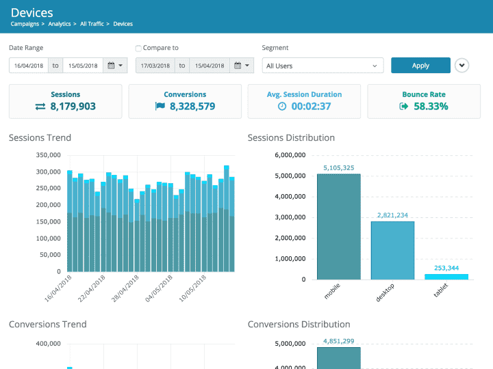Easily view organic traffic segmented by desktop, mobile, or tablet to measure value of ranking and SEO efforts.
