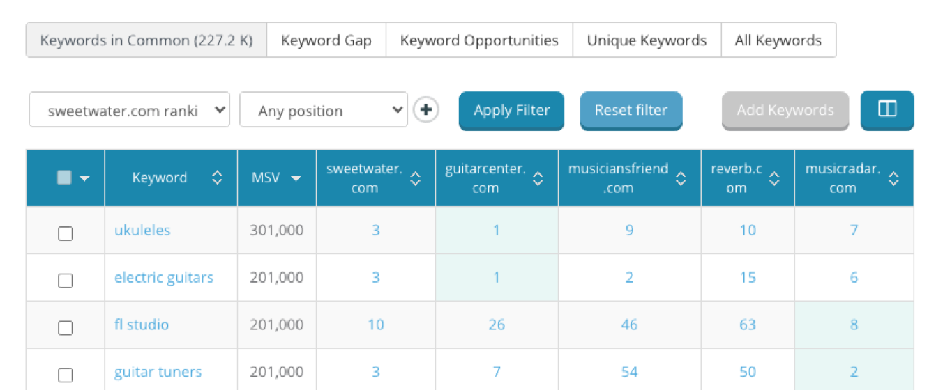 Below the chart we can see the ranking keywords for each site. In addition to Keyword Gap and Keywords in Common, we’ve added 3 more intersection types for even more flexible ways of comparing each site.
