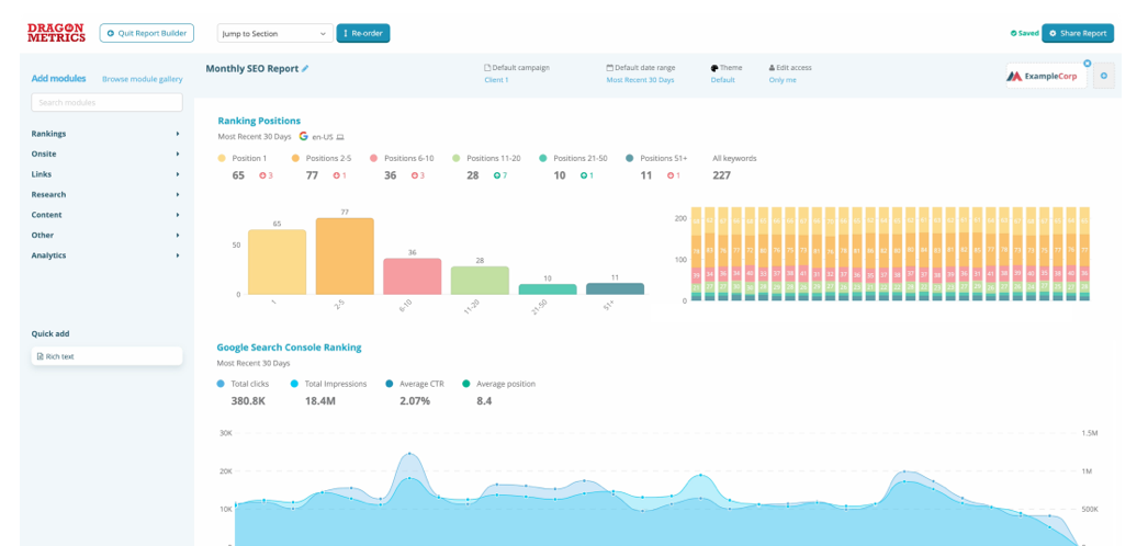 In fact, every single tool and report in the Dragon Metrics platform is available as a Report Builder 2.0 module, so that means anything you’ve seen in the app can be added to a custom report.