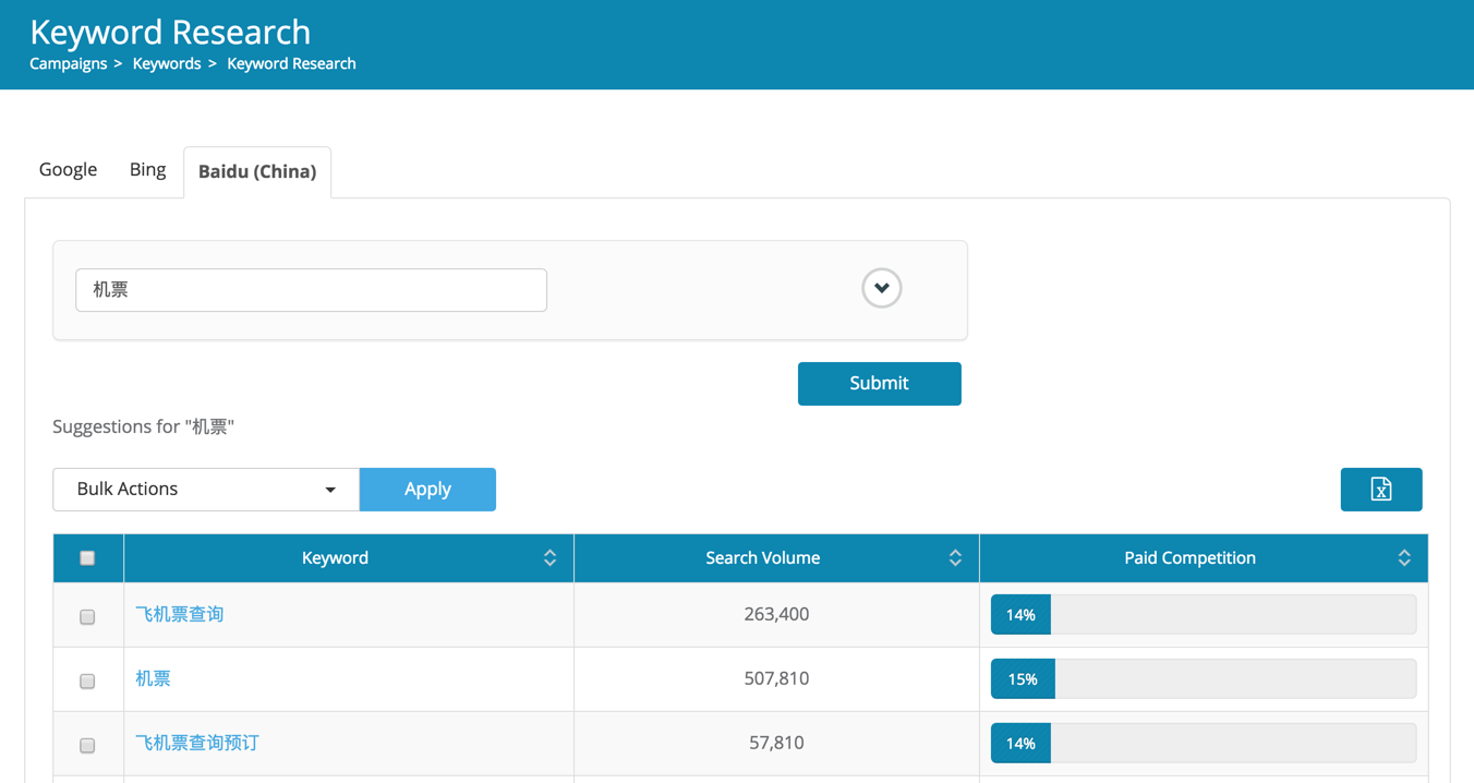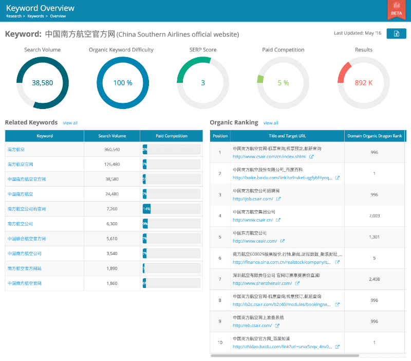 We totally understand your pain in doing Chinese SEO. That’s why we've developed extensive Baidu keyword research capabilities within Dragon Metrics specially designed for international marketers. With Dragon Metrics Keyword Research Tools, you can: