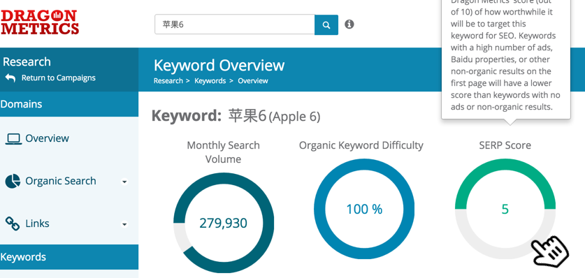 SERP Score in Dragon Metrics “Baidu Research” Feature
