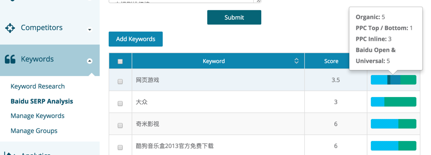 In Dragon Metrics has developed a metric called SERP score to assess the organic SEO environment of each keyword on the Baidu SERP. With this single number, you can see how Baidu-owned properties, ads, and rich snippets are affecting a particular SERP in Baidu. In essence, SERP Score is a measure from 0 to 10 on how suitable this keyword is for typical organic SEO tactics. The fewer Baidu-owned properties, ads, and rich snippets appearing on page 1 for a keyword, the higher the SERP Score will be.