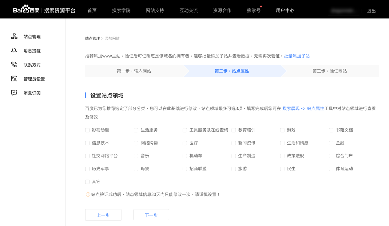 After entering your website’s home address, you will need to tell Baidu the industry categories your site is about – Here‘s their English translation from Google Translate.