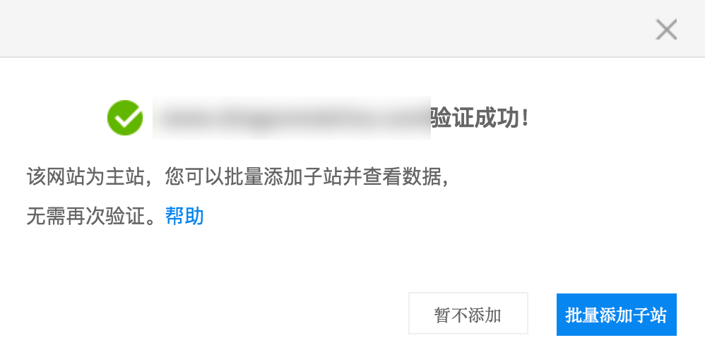 This screen will be shown upon verification success. It will prompt you to add subdomains by clicking on the blue button 批量添 子站 if you wish, otherwise you can just click 暂不添 to proceed.