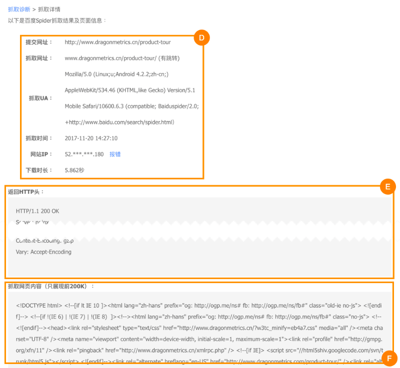 Within Baidu Webmaster Tools you can diagnose potential SEO issues by checking using Crawl Diagnostic Tool (抓取诊断). 200 fetches are available for each site every week, and the fetch results will only show content of the first 200 KB of content.