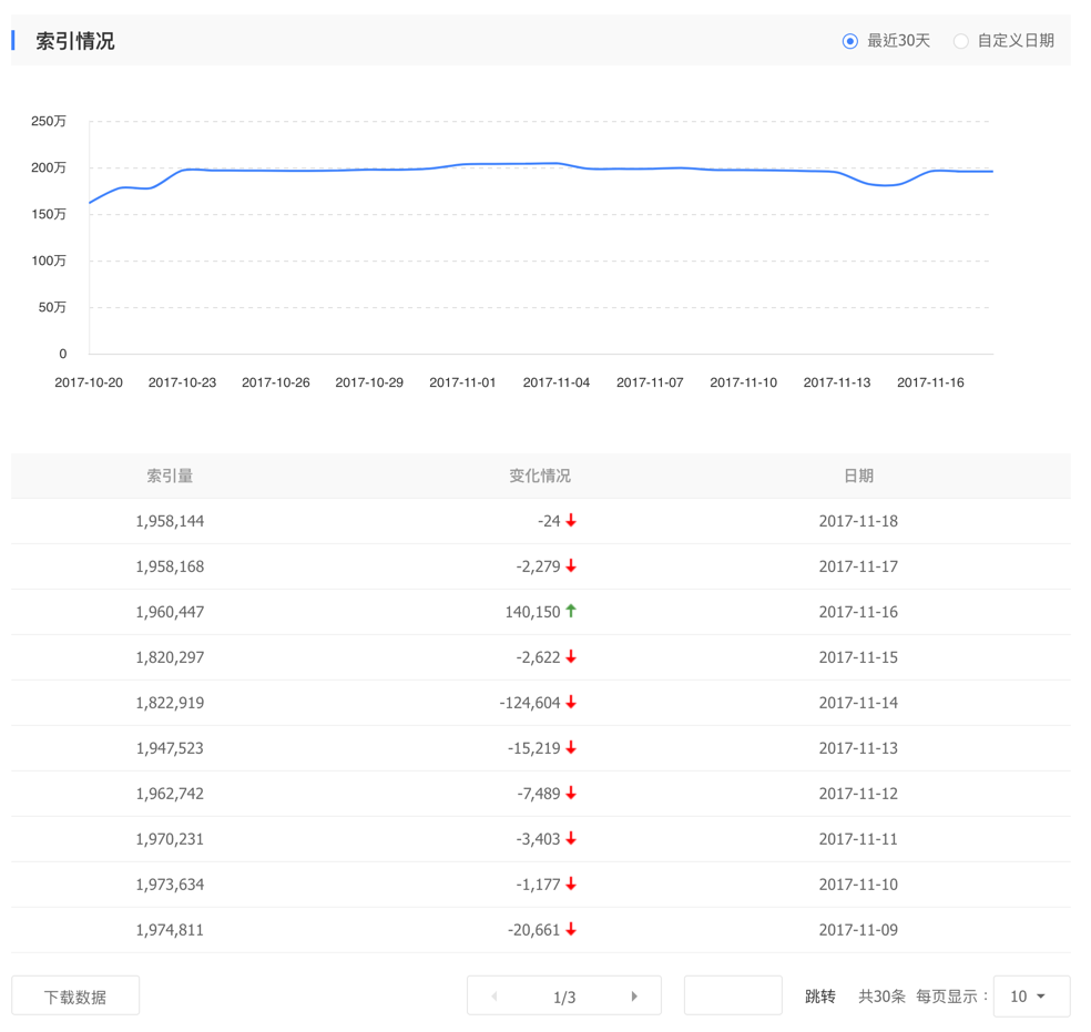 Probably the most important feature for any search engines’ webmaster tools is to check for ranking keywords and their impression and clicks. In Baidu Webmaster Tools’ Traffic and Keywords (流量与关键词) section, webmasters can get their sites’ impressions and clicks from Baidu organic search results in a daily, weekly and monthly level, as well as the impressions and clicks for your sites top keywords for the last 30 days. Top landing pages are also provided so you can get a sense of how your pages are performing in Baidu. There is a maximum of 50,000 rows on each report.