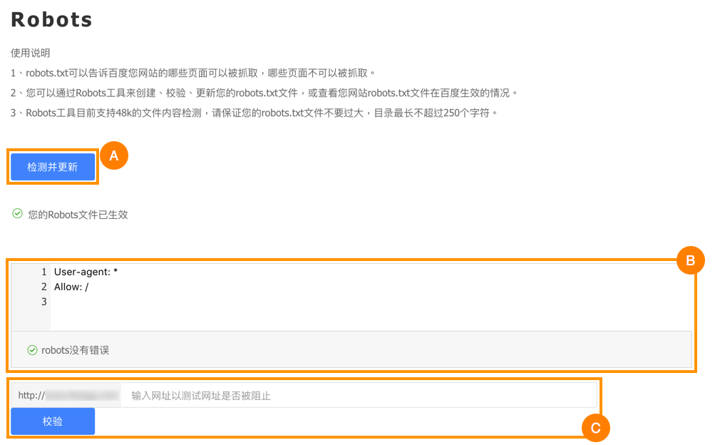 The robots.txt file is a document placed in your site’s root directory to inform search engines which pages should be crawled and which should not be crawled. With the robots tool in Baidu Webmaster Tools you can create, validate or update your robots.txt file, or check your site current robot.txt saved on Baidu.