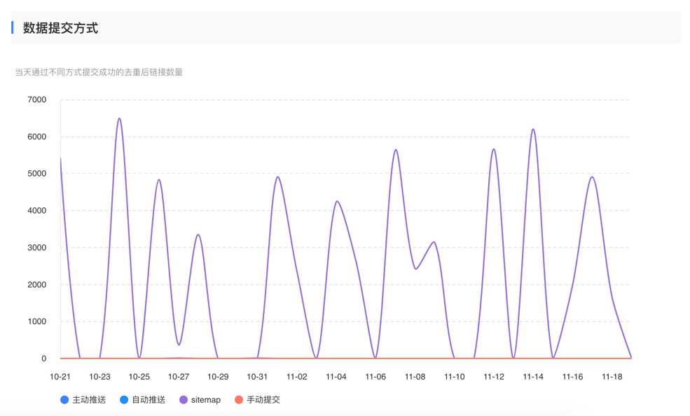 You can track your submission stats overtime in Baidu webmaster Tools as well. In the screenshot below, you can see that the site is primarily relying on sitemap for URLs submission (The purple line).