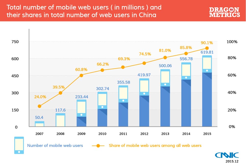 According to CNNIC (Chinese), in 2015 there were a total of 620 million mobile web users in China, which is 90% of all web users in China! Among these users, 127 million access the web exclusively on mobile devices, which is 18.5% of the all web users.