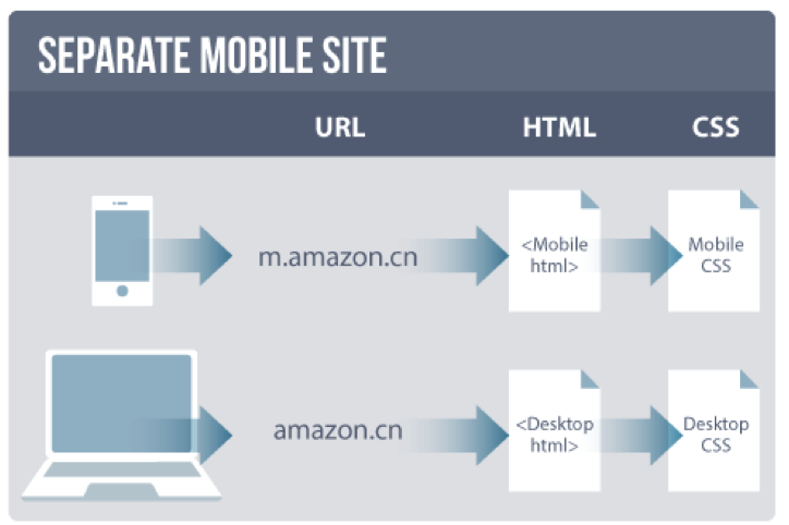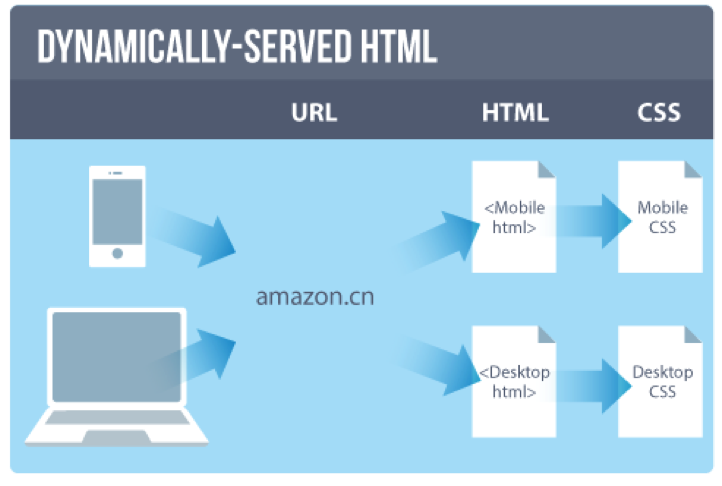 A separate mobile site serves completely separate HTML and CSS on a separate URL (usually on the “m” subdomain, e.g. m.example.com). Dynamically served HTML keeps a single URL for both desktop and mobile sites, but delivers different HTML and CSS to each. Responsive design uses the exact same URL and HTML content for both mobile and desktop, and simply customizes the CSS each screen size separately.
