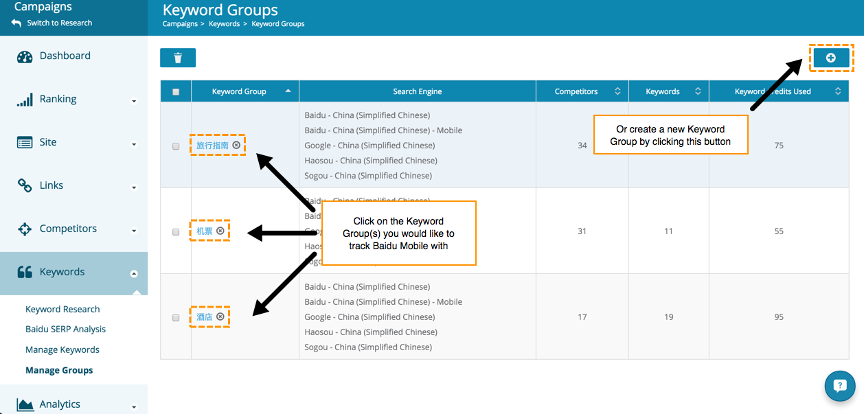Select an existing keyword group that you would like to track Baidu Mobile with, or create a new keyword group.