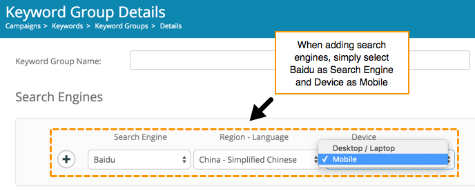 If you already have a campaign and keyword group in Dragon Metrics set up, just to go the manage keyword groups page to add Baidu Mobile to your tracked search engines.