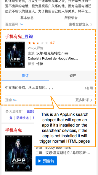 AppLink is a type of structured data Baidu mobile offers for app call within SERPs, if your app is registered to AppLink service, searchers can access information they are looking for within your app from the text links from the search results. The project is currently in public beta and if you are a mobile app developer and looking to promote your app in China, AppLink is the way to go, learn more here (Chinese).