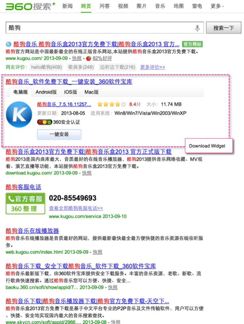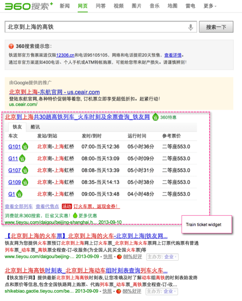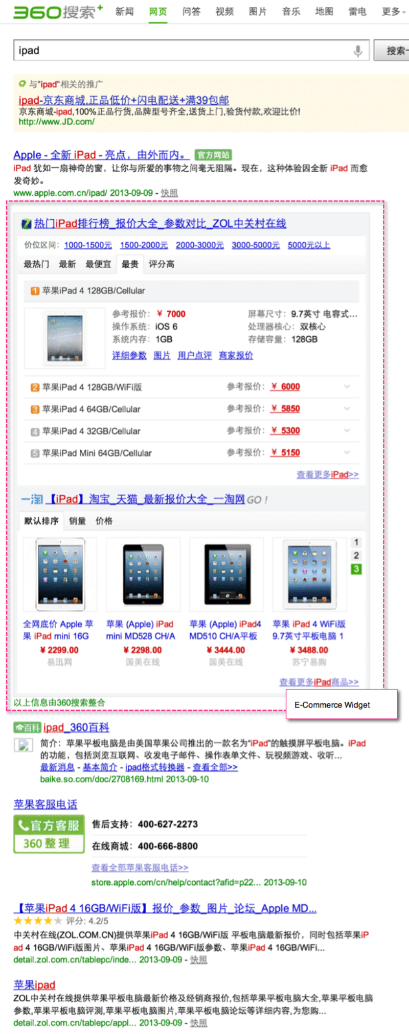 Qihoo and Baidu do share one SERP layout feature in common, however, and that is the ability for 3rd party widgets. In Baidu, it’s called Baidu Open, while in Qihoo 360 it’s called oneBox. The service allows advertisers to create a customized widget that can be served up in SERPs.