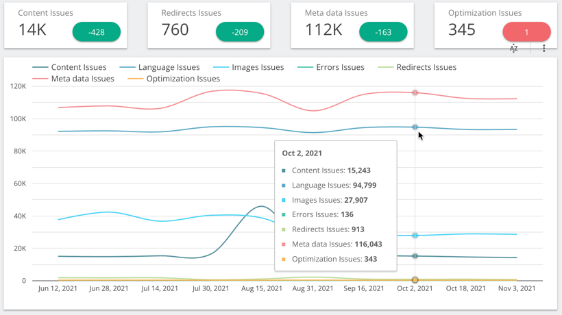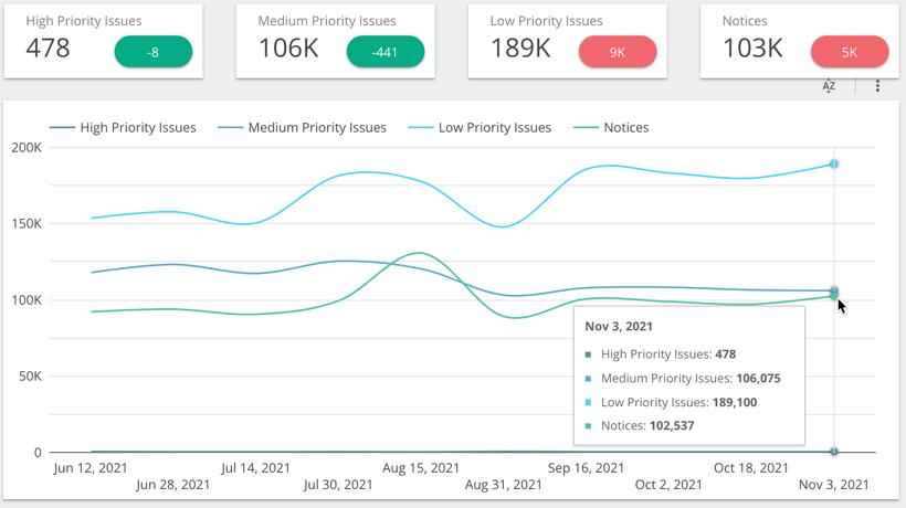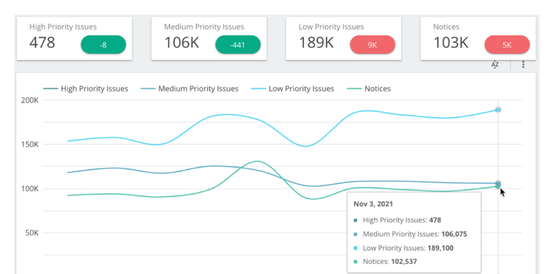 Distribution of issues, grouped by priority (e.g. high/medium/low/notice). Available as a trend or for a single crawl as compared the previous crawl.