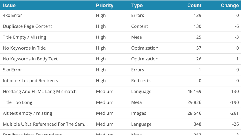 This connector provides a data table listing each issue included in Site Audits along with the number of URLs affected by each, the issue type and priority, and how it’s changed since the previous crawl.