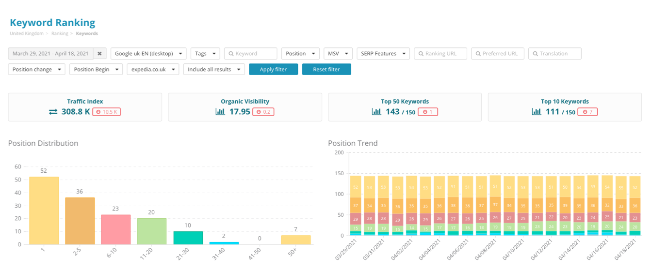 Below the filter, we’ve added charts showing how many keywords are ranking at position 1, positions 2-5, 6-10, etc.