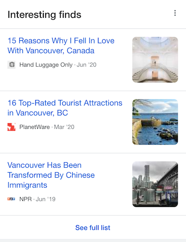 First up is a result type called Interesting Finds. This feature shows up for popular search terms on mobile devices only. Any site is eligible to rank in this area, so it’s not just reserved for Google or sites with AMP. Three listings are usually shown by default, with a “See full list” link at the bottom which will display even more results.