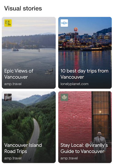 Also only shown on mobile devices, Visual Stories are a unique type of AMP content. Clicking an a visual story will show a fast-loading full-screen experience, typically a video, image, or animation.