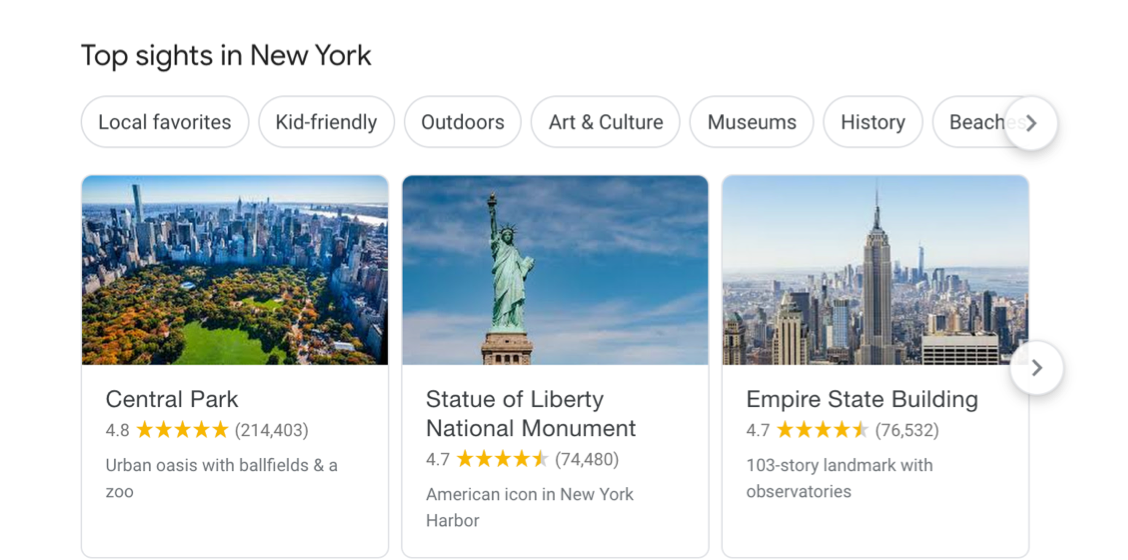Top Sights (no, not Top Sites) is shown on travel-related keywords, especially for “things to do in [place name]” keywords. Shown on both desktop and mobile, a carousel of results are shown each with a star rating a short description.